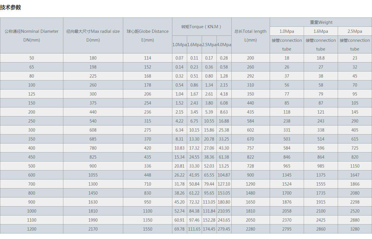 | 公稱(chēng)通徑Norminal Diameter DN(mm) | 徑向很大尺寸Max radial size D(mm) | 球心距Globe Distance E(mm) | 轉(zhuǎn)矩Torque(KN.M) | 總長(zhǎng)Total length L(mm) | 重量Weight | |||||