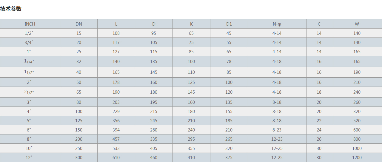 | INCH | DN | L | D | K | D1 | N-φ | C | W |