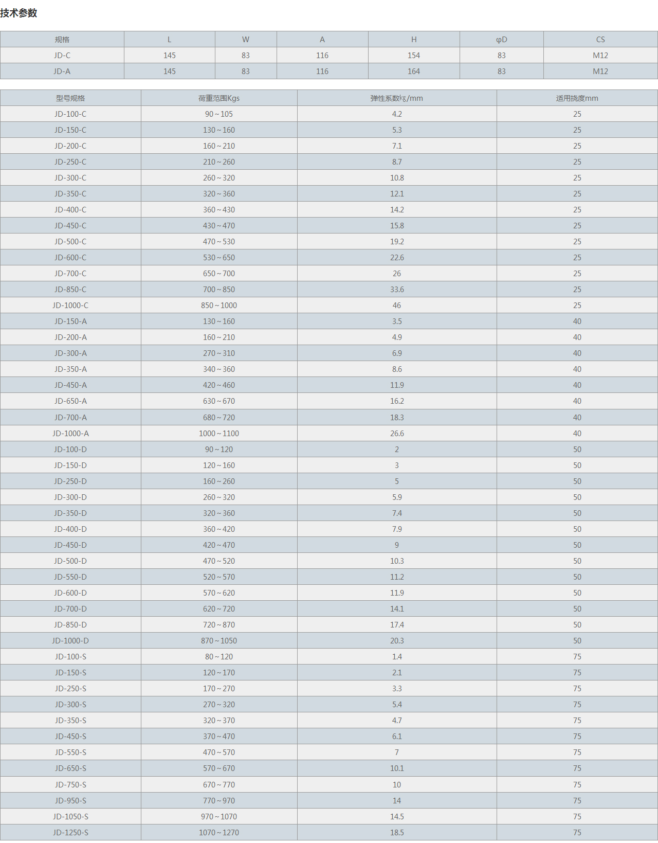 | 型號(hào)規(guī)格 | 荷重范圍Kgs | 彈性系數(shù)㎏/mm | 適用撓度mm |