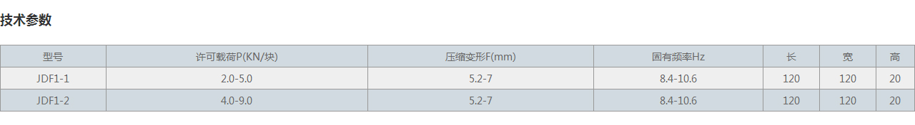 | 型號(hào) | 許可載荷P(KN/塊) | 壓縮變形F(mm) | 固有頻率Hz | 長(zhǎng) | 寬 | 高 |