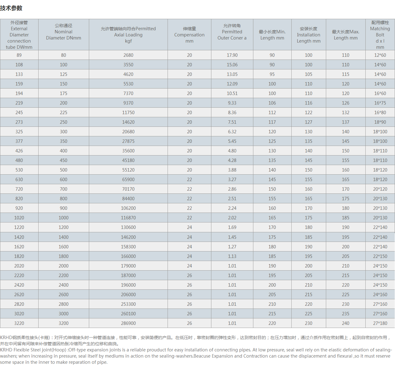 KRHD Flexible Steel joint(Hoop) :Off-type expansion joints is a reliable prouduct for easy installation of connecting pipes. At low pressure, seal well rely on the elastic deformation of sealing-washers; when increasing in pressure, seal itself by mediums in action on the sealing-washers.Beacuse Expansion and Contraction can cause the displacement and flexural ,so it must reserve some space in the inner to make reparation of pipe.