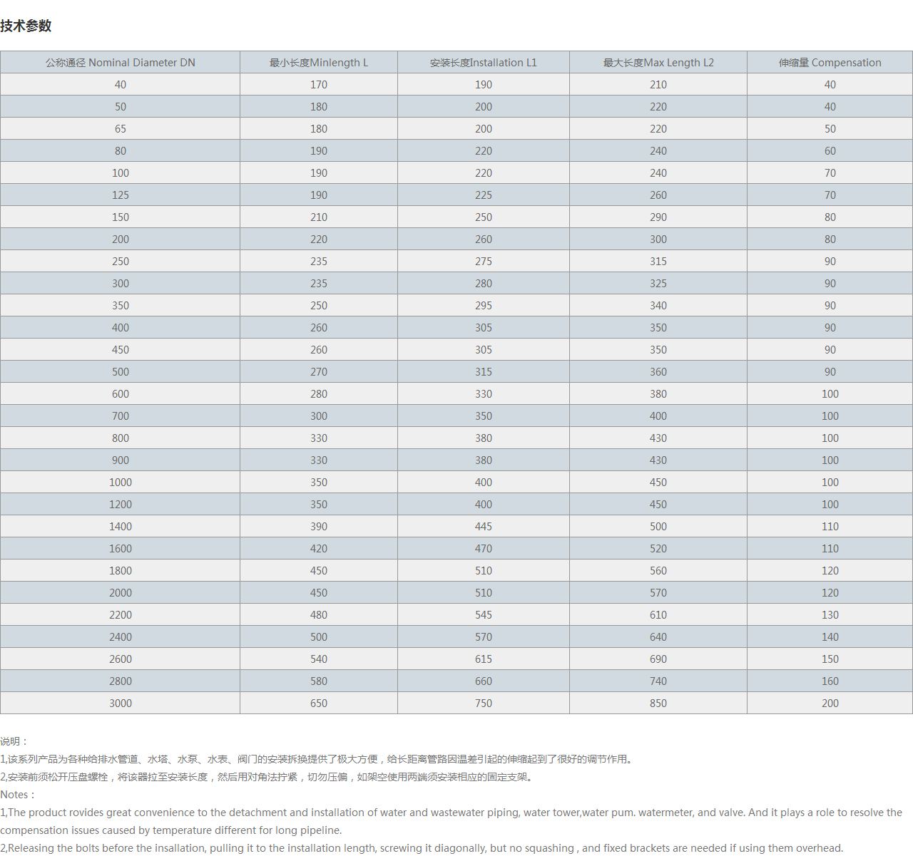 | 公稱通徑 Nominal Diameter DN | 很小長度Minlength L | 安裝長度Installation L1 | 很大長度Max Length L2 | 伸縮量 Compensation |