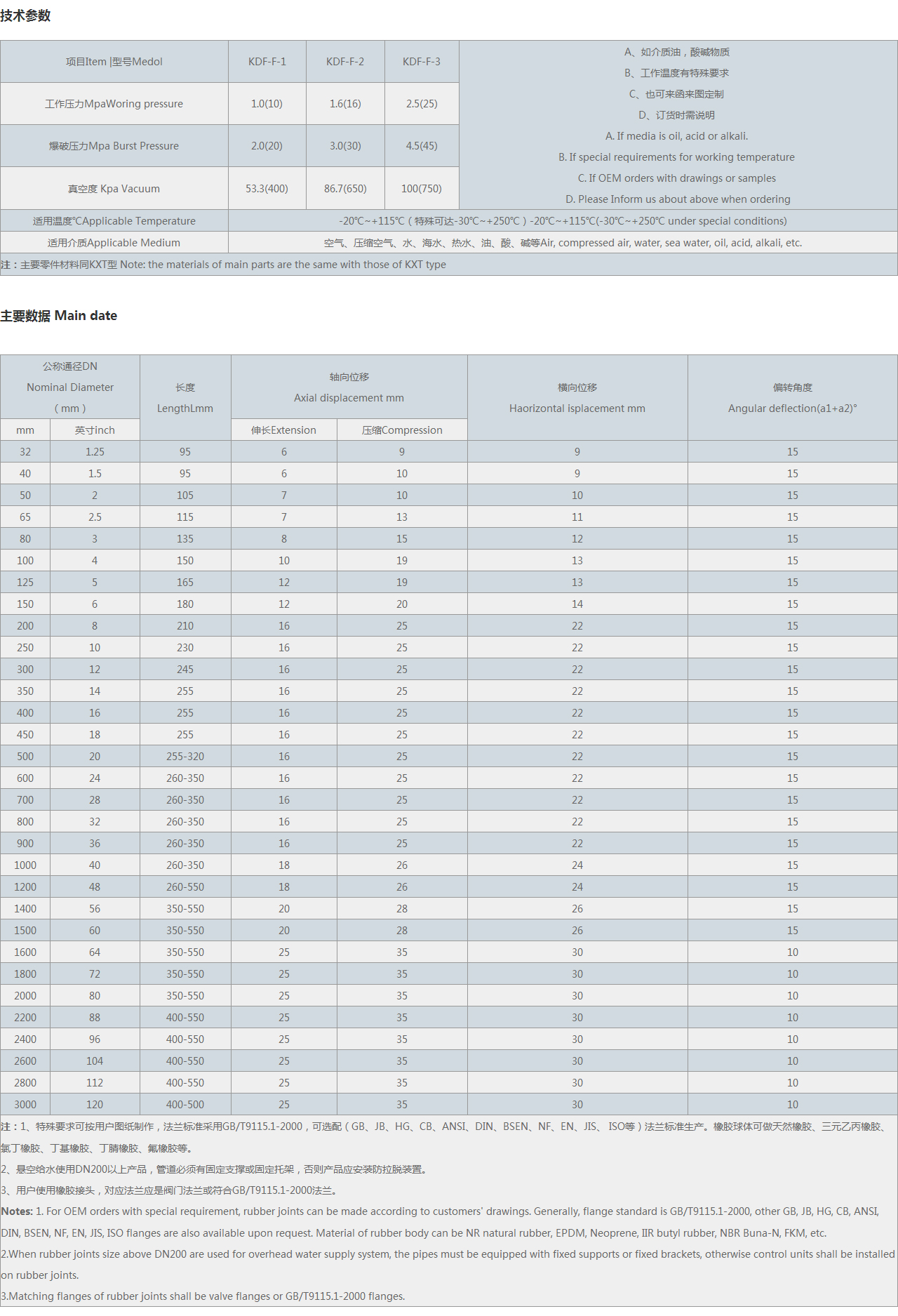 KDF-F翻邊型橡膠軟接頭更是改良了單球體橡膠接頭在過高的壓力下發(fā)生的拉脫狀況,改良后的大翻邊橡膠接頭密封面與平焊法蘭外徑一致,而且球體密封面上有鉆孔,完全將橡膠接頭與管道連接成一個(gè)整體,從而提高了橡膠接頭使用的穩(wěn)定性。它是一種高彈性、高氣密性、耐介質(zhì)性和耐氣候性的管道接頭。由于可曲撓橡膠軟接頭有良好的綜合性能,主要用于原水和污水的提升和輸送,火力發(fā)電廠的給水和冷卻循環(huán)水,冶金行業(yè),冷凝水,化工行業(yè)的化學(xué)物質(zhì)的管道輸送,石化行業(yè)的冷卻,稀釋及其它行業(yè)長短距離管線間的柔性連接。因?yàn)橄鹉z具有較高的耐磨性,還適用于一切行業(yè)的粒狀和粉狀及汽體的輸送。