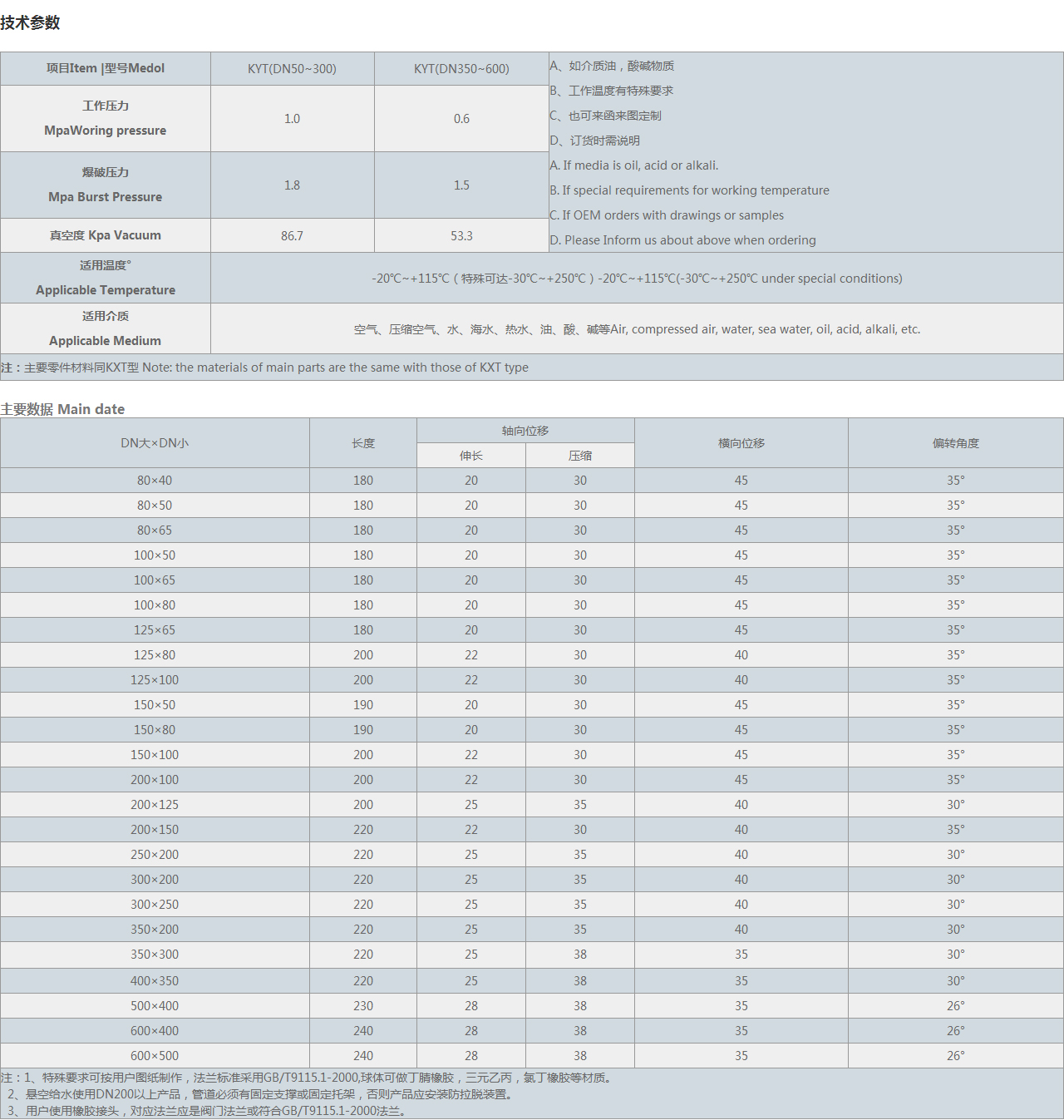 | 項目Item |型號Medol | KYT(DN50~300) | KYT(DN350~600) | A、如介質(zhì)油,酸堿物質(zhì) B、工作溫度有特殊要求 C、也可來函來圖定制 D、訂貨時需說明 A. If media is oil, acid or alkali. B. If special requirements for working temperature C. If OEM orders with drawings or samples D. Please Inform us about above when ordering |